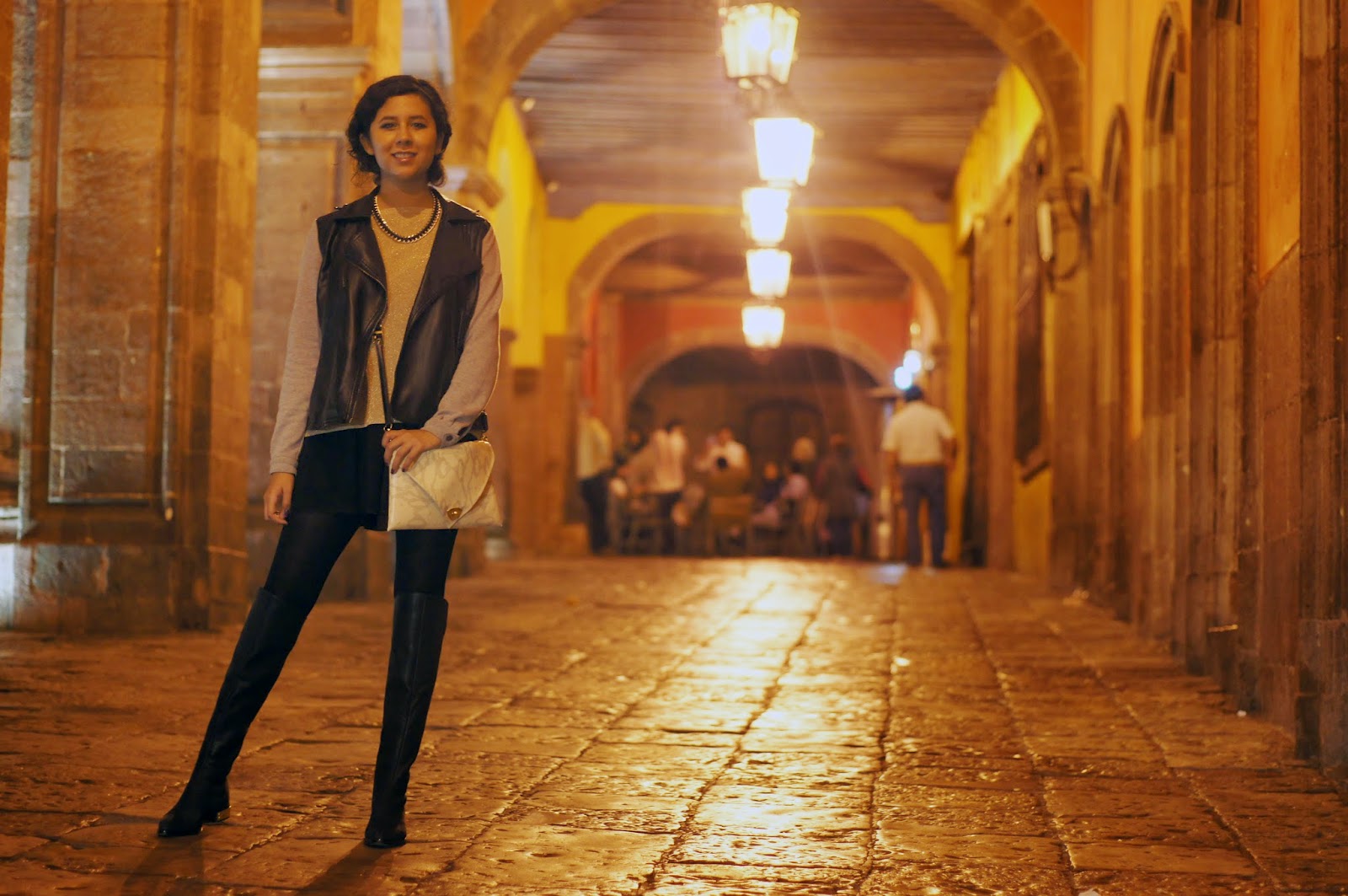 Durante la noche, San Miguel de Allende se transforma en un pueblo totalmente diferente. Las luces que iluminan la iglesia y muchos de los edificios principales, hacen que los turistas podamos apreciar la arquitectura del lugar, desde otra perspectiva. Otro de los factores que hace que cualquier noche en la plaza se vuelva mágica, es la presencia de varios grupos de mariachis que durante unas horas cantan canciones dedicadas al amor o al desamor. Despúes del abrazador sol del día, la ciudad se torna fresca y la temperatura llega a bajar mucho, lo cual me sirvió de pretexto para sacar a pasear por un rato mis botas a la rodilla. Tratamos de tomar muchas fotos ese día aunque al final preferimos sentarnos en el kiosco mientras observabamos la luna gigante y luminosa para tomar muchas fotos mentales sobre ese lindo momento.